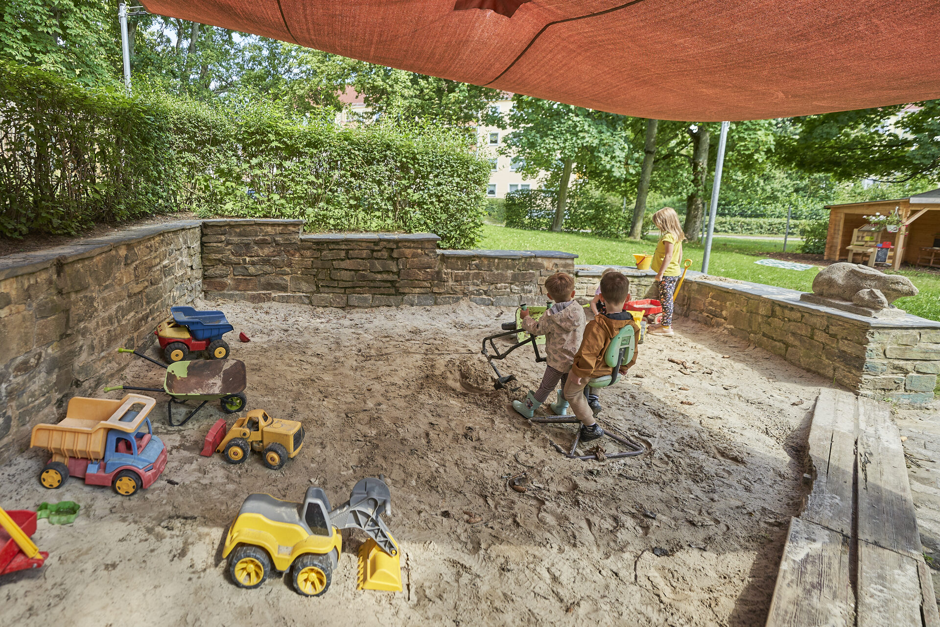 - mehr Spiel und Spaß im Freien: ein Gartenhaus und ein „Pferdestall“ ermöglichen Rollenspiele auch im Freien, im Sommer laden Wassermatschanlage, Sprinkler und Wasserspiele zum Planschen ein