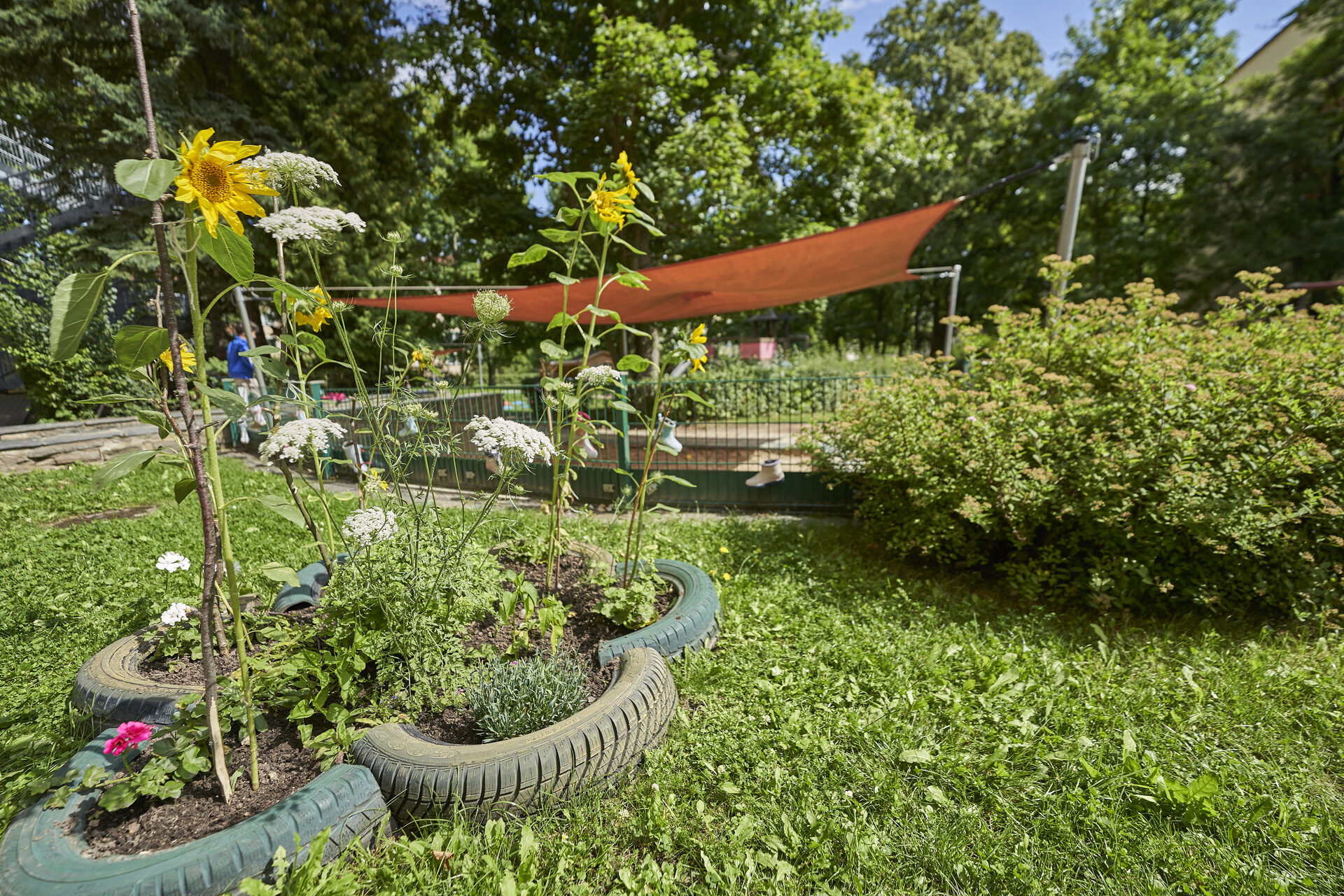 - mehr sinnliche Erfahrungen und Erlebnisse: unter großen schattigen Bäumen, in unserer Wildblumenwiese, im Weidentunnel, an den Naschsträuchern, in vielen kleinen Rückzugsorten, in der Matschküche