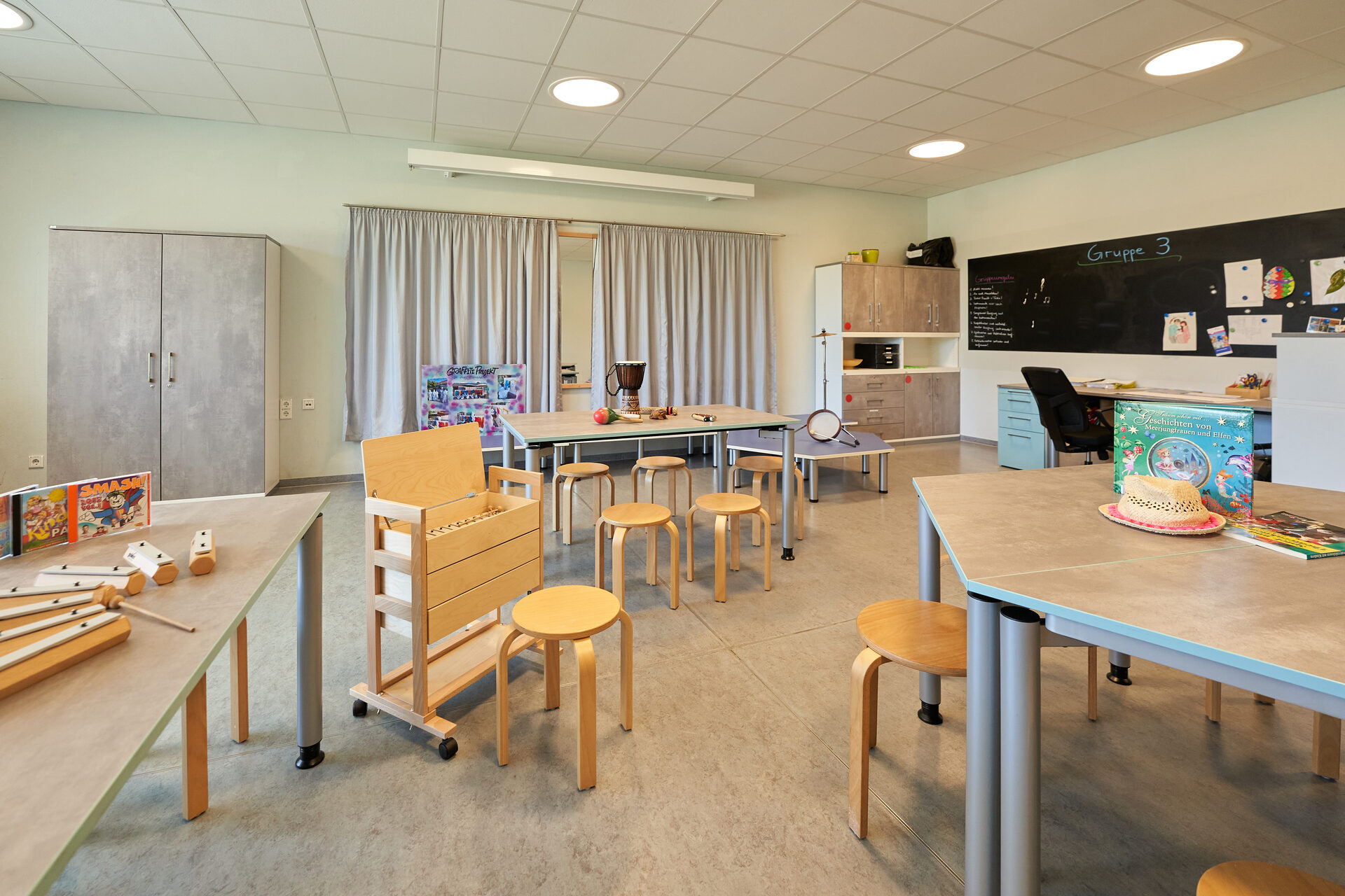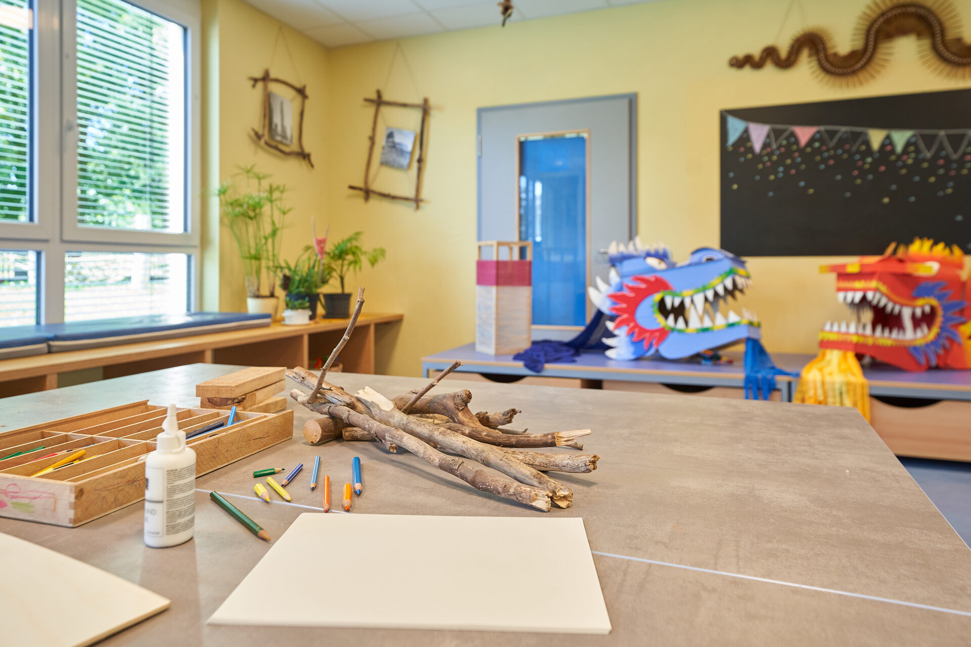 Neben großzügig gestalteten, individuell und bedürfnisorientierten, hellen Gruppenräumen stehen unseren Kindern insgesamt sieben Funktionsräume zur Verfügung. Unsere Kinderküche lädt zum gemeinsamen Backen und Kochen ein. Im Kreativ- und Bastelzimmer kommen kleine Künstler und angehende Nähexperten voll und ganz auf ihre Kosten. Unsere Kinder bekommen beim Verarbeiten von Holz, Pappe und selbst hergestellten Naturfarben handwerkliche Fähigkeiten spielend gelernt. In der Bücherinsel finden unsere Kinder nach der Schule Zeit zum Träumen und Verweilen. Zweimal pro Woche erhalten wir ehrenamtliche Unterstützung für Schüler, um das Lesen zu fördern. In der großzügigen Turnhalle finden regelmäßig Bewegungsangebote statt.
