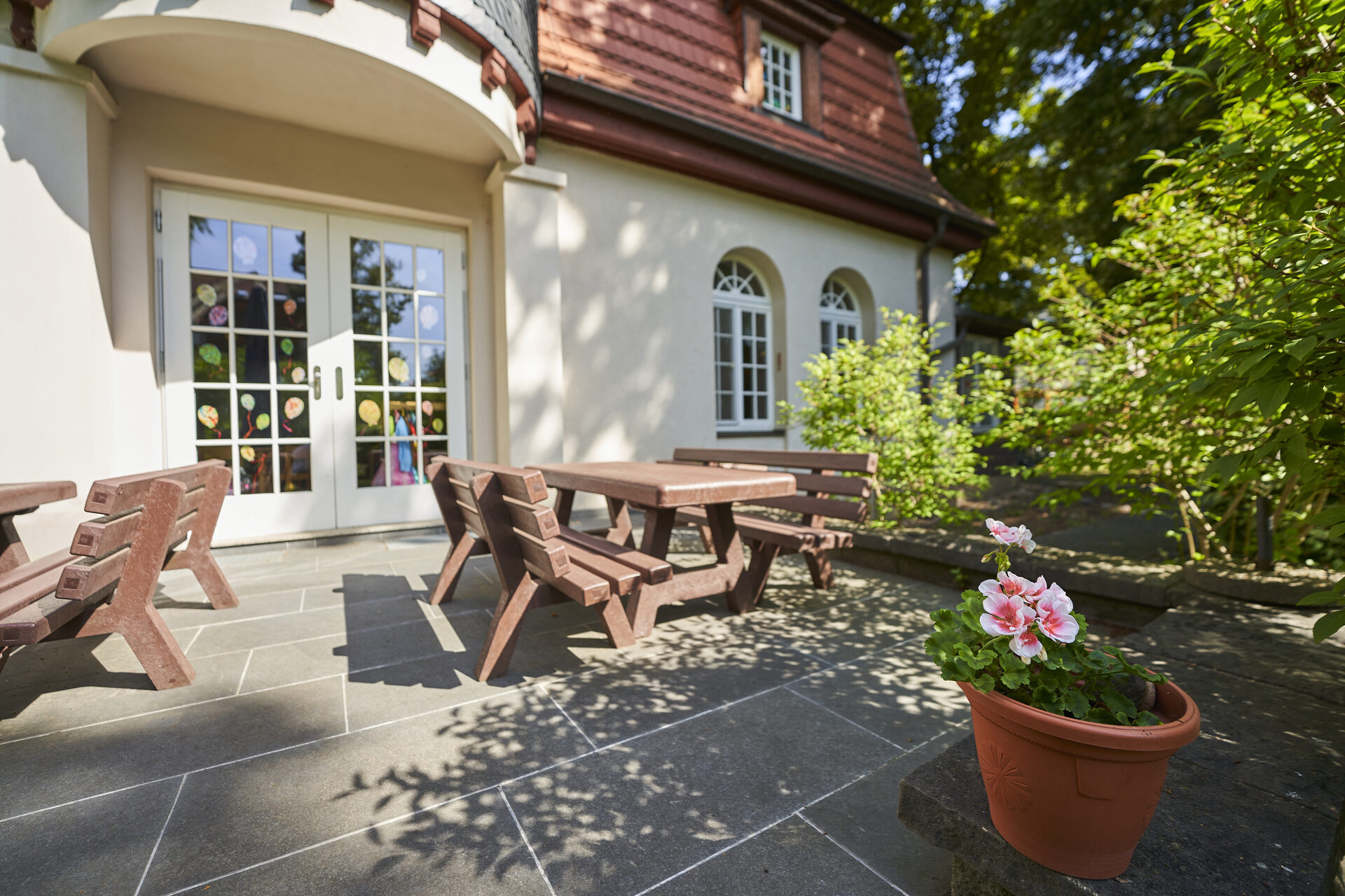 Im Sommer verlegen wir unseren Tagesablauf mit Einnahme der Mahlzeiten gern in unseren Garten („Gruppenzimmer im Grünen“).