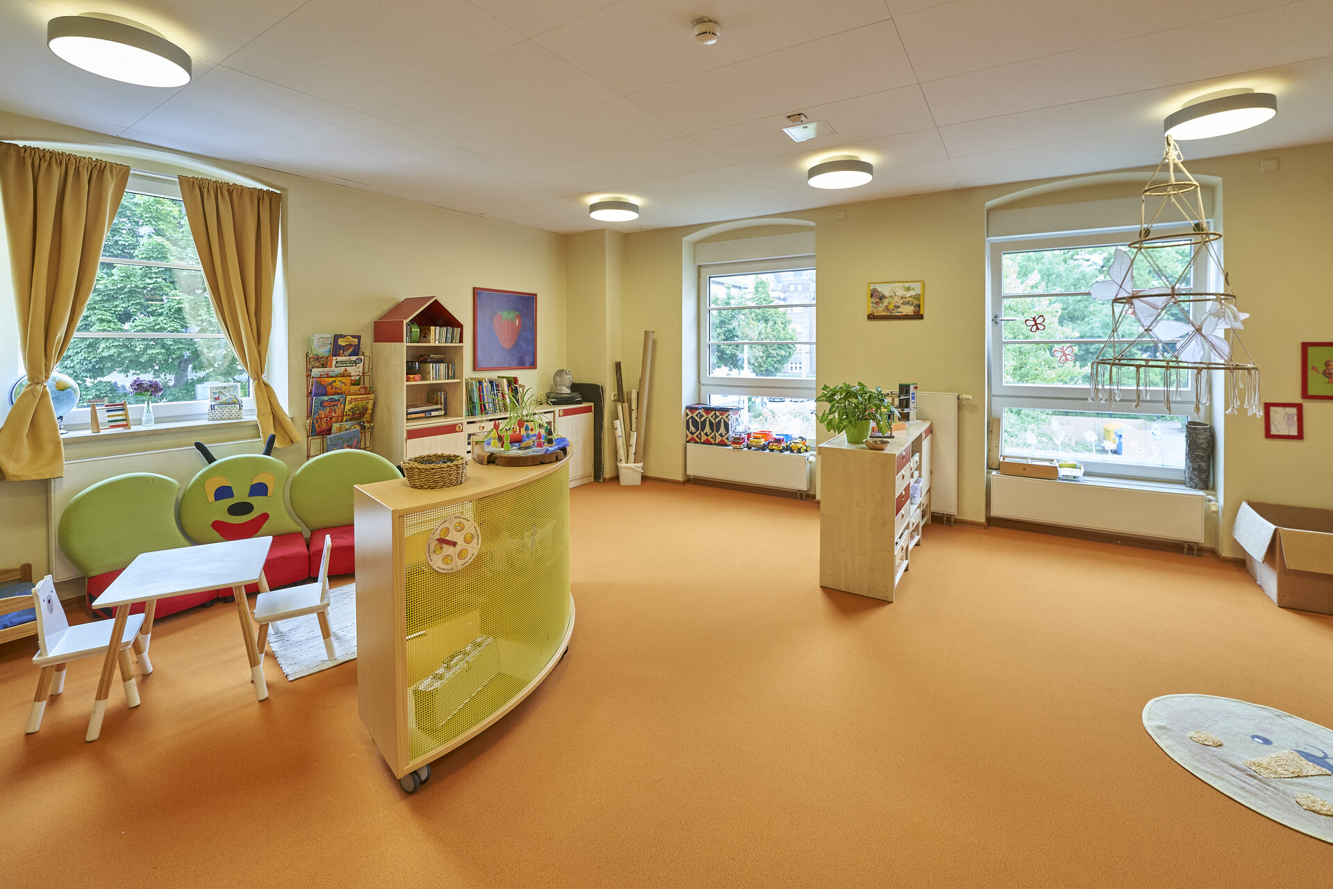 Unsere Kita in der Stephan-Roth-Str. 14/16 (2 Krippengruppen, 3 Kindergartengruppen, 3 Hortgruppen) und unser Hortgebäude am Nordplatz 8 (5 Hortgruppen) empfängt die Kinder in hellen, freundlichen Räumen mit großen Fenstern und spannenden Hochebenen. Direkt angrenzend sorgen praktische Garderoben- und Sanitärbereiche für reibungslose Abläufe.