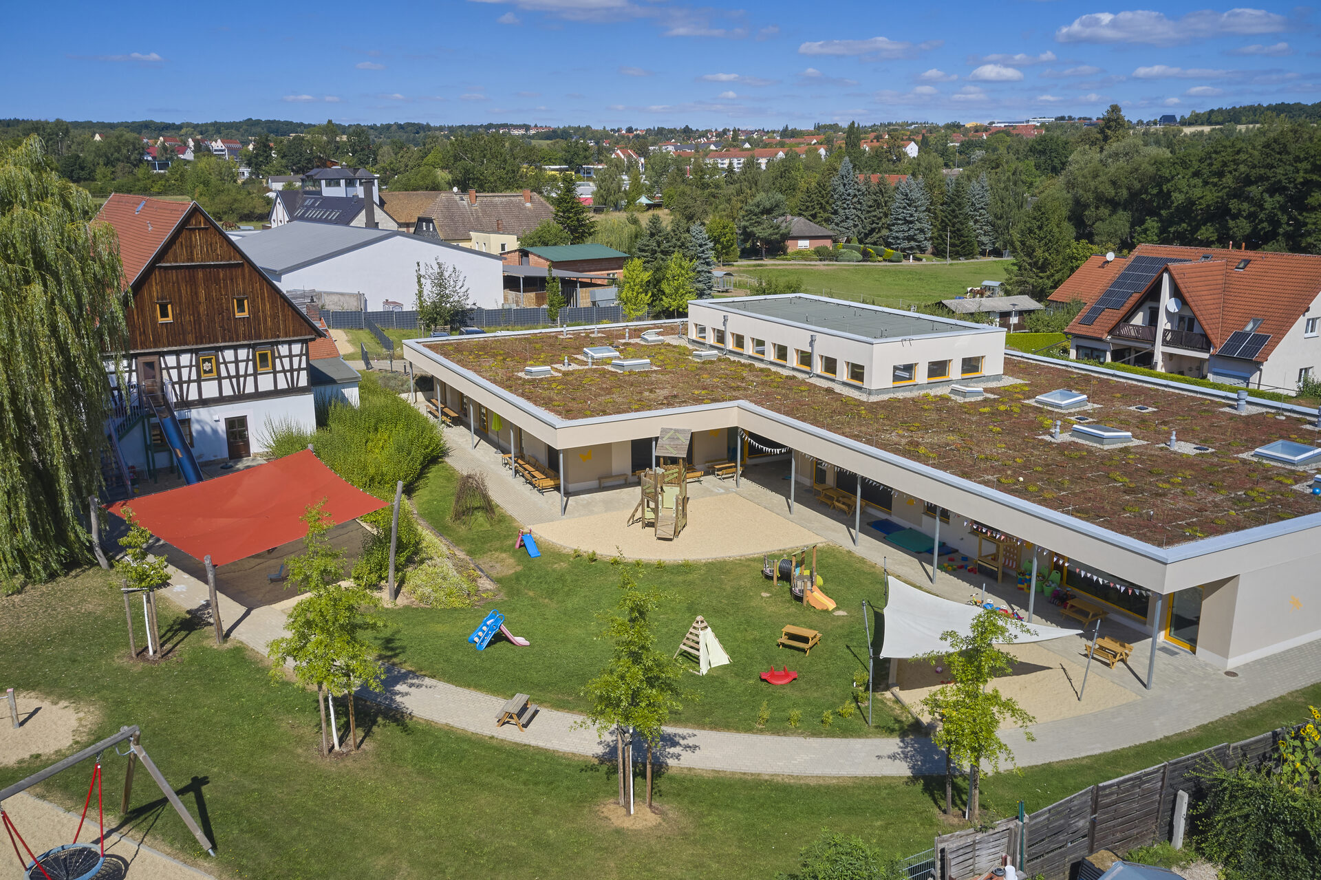 In dem noch vorhandenen, sanierten Fachwerkgebäude des ehemaligen Bauernguts sind unsere Hortkinder untergebracht. Unsere Krippen und Kindergartenkinder dürfen sich über einen neu erbauten Flachbau freuen. Dieser ist barrierefrei, mit Behinderten-WC und höhenverstellbarer Wickelkommode ausgestattet, sodass auch Kinder mit Einschränkungen bei uns herzlich willkommen sind.