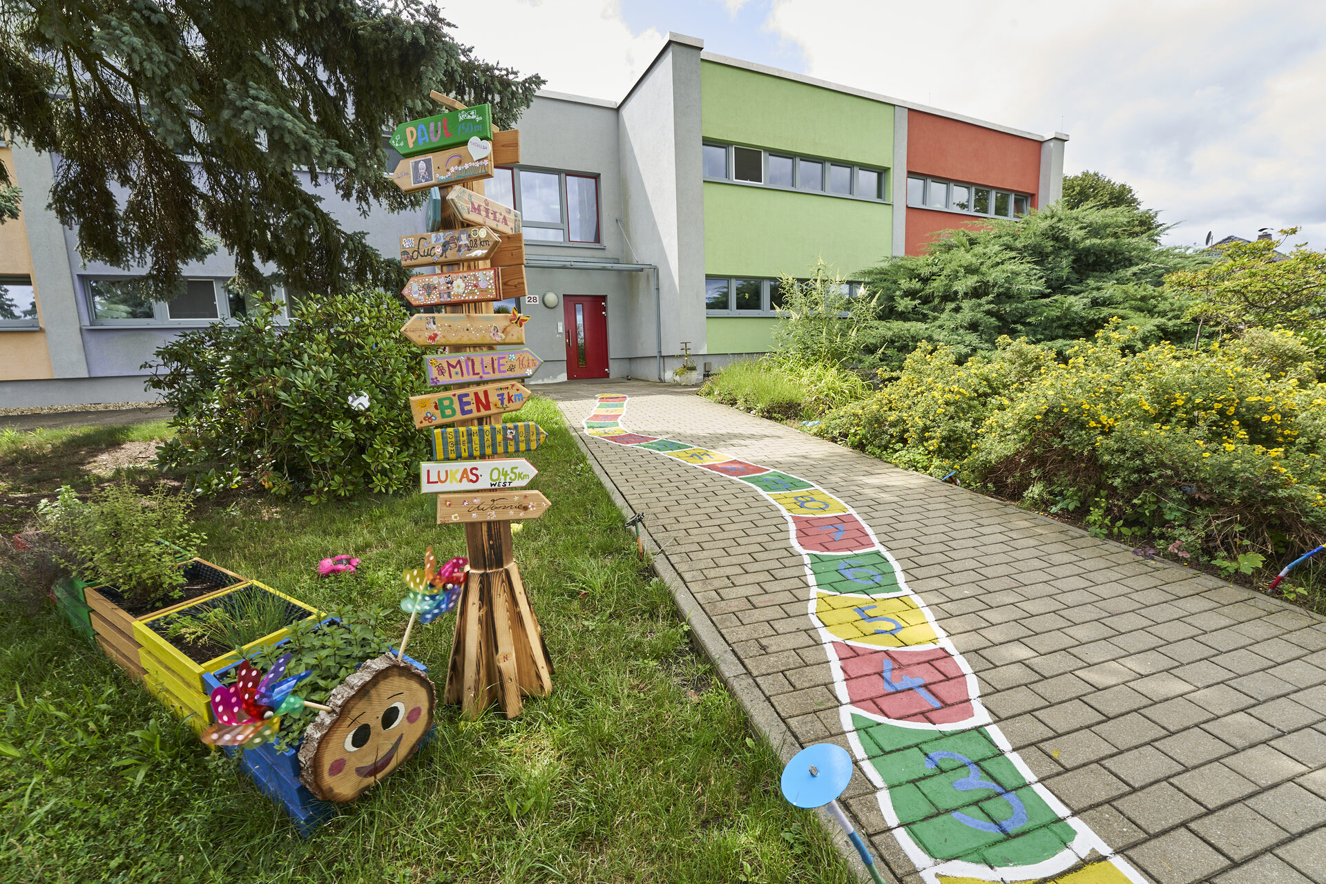 Der Außenbereich unserer Kita umfasst ein ca. 4500 qm weitläufiges Gelände, das mit vielen schattenspendenden Bäumen bewachsen ist und abseits der Hauptstraße liegt, wodurch er nicht einsehbar ist.