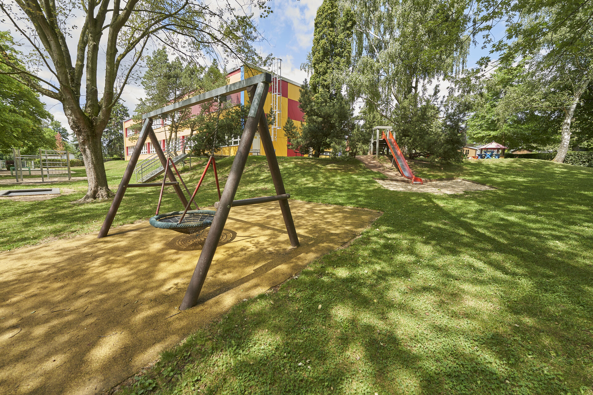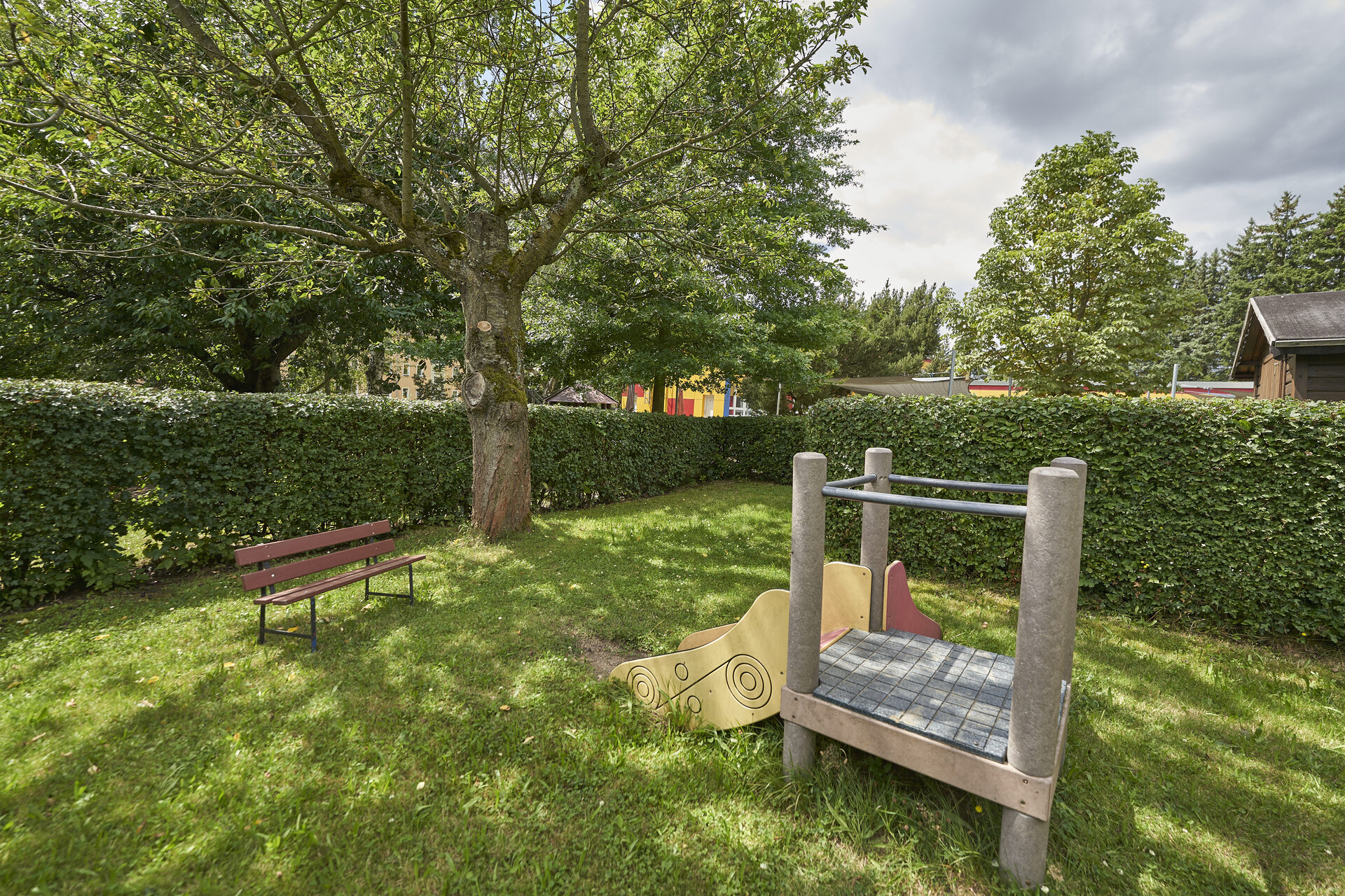 eine Rollerstrecke, ein Klettersechseck, ein Bolzplatz, ein Trampolin, eine Vogelnestschaukel, eine Hangrutsche mit Turm, eine Bewegungsbaustelle, ein Sinnespfad mit Naschgarten, zwei große Sandkästen, ein Spielhaus, eine Federwippe, ein Kletterturm für Krippenkinder, eine Slackline und viele kleine Rückzugsecken. Außerdem gibt es vielfältige Geräte für Sport und Spiel.